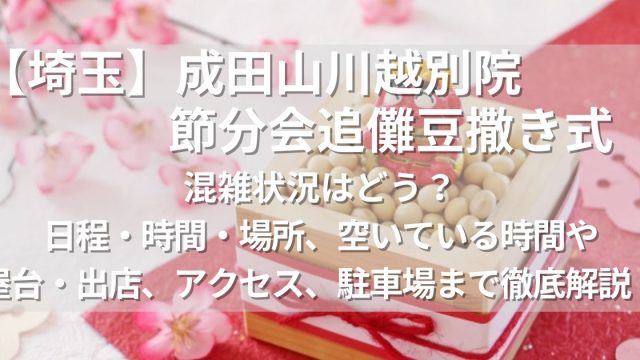 節分【川越】成田山川越別院 節分会追儺豆撒き式2025の混雑状況はどう?駐車場、口コミまで徹底解説! この記事では埼玉県川越市にある、成田山川越別院 節分会追儺豆撒き式2025の駐車場情報、混雑状況、空いている時間や日程・時間・場所・屋台・出店からアクセス、駐車場、口コミまで分かりやすく解説します。節分
