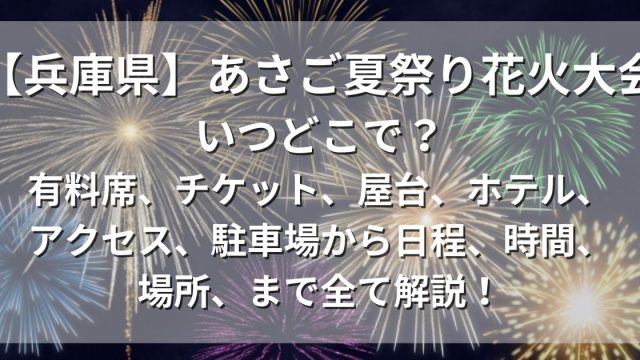 花火大会【朝来市】あさご夏祭り花火大会2024はいつどこで?出店、屋台、駐車場から日程、時間、場所まで全て解説! この記事では兵庫県朝来市で行われるあさご夏祭り花火大会2024はいつどこで開催されるのか、日程、時間、場所、有料席、チケットなどの基本情報から屋台・出店、混雑状況、アクセス、駐車場情報まで全て分かりやすく解説します。花火大会